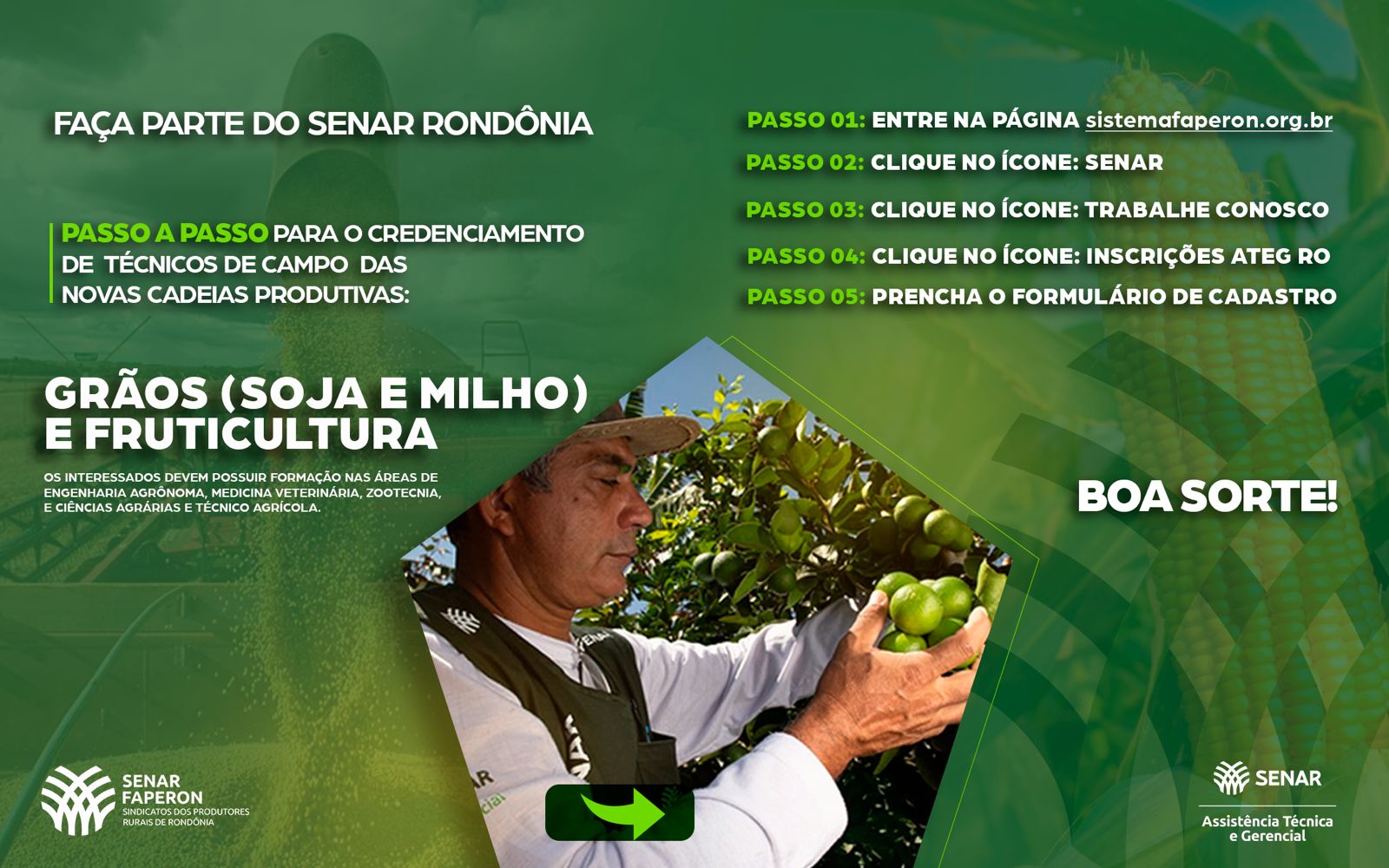 O Serviço Nacional de Aprendizagem Rural (Senar Rondônia) está expandindo suas atividades de Assistência Técnica e Gerencial (AteG), com a abertura do credenciamento para novos técnicos que desejam prestar assistência aos produtores rurais das cadeias produtivas fruticultura e grãos (milho e soja), nos municípios de Rondônia. Com a implantação da nova cadeia produtiva, o Senar busca suprir essa carência abrindo credenciamento para novos técnicos de campo. O objetivo é começar a atender, no início de 2024, mais de 200 produtores nas principais regiões de produção do estado.