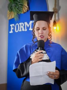 Representando a turma, a oradora Maria Valdiane falou sobre persistência. Lembrou das madrugadas de estudo, das atividades práticas e do apoio recebido dentro de casa. “Nem sempre foi fácil. Teve cansaço, teve dúvida, mas teve principalmente vontade de aprender e melhorar nossa realidade”.